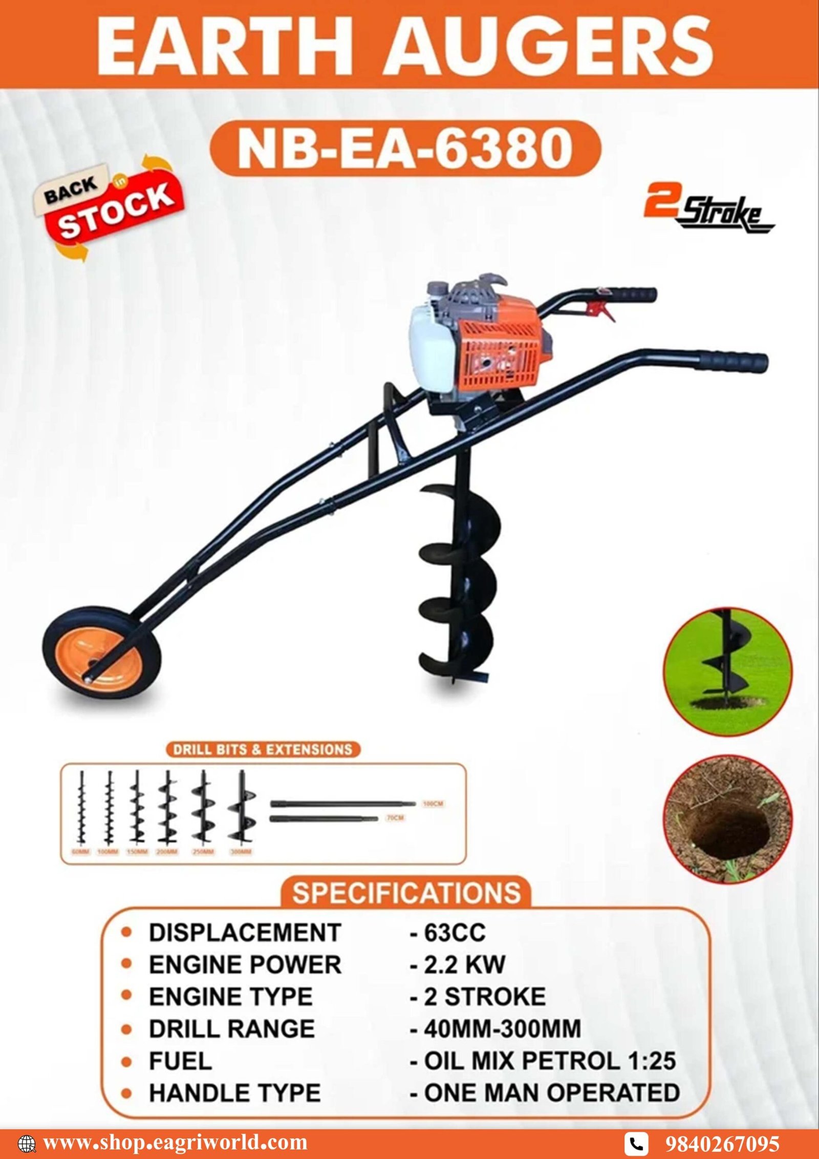 The TAW 63 CC 2 Stroke Trolley Earth Auger (Model: TAW–EA-6380) is a powerful and efficient tool designed for drilling holes in the ground, often used for tasks like post hole digging, fencing, or planting trees. Here’s a detailed description of the product: